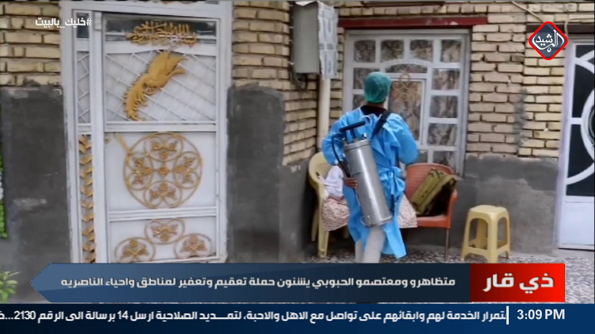 متظاهرو ومعتصمو الحبوبي يشنون حملة تعقيم وتعفير لمناطق وأحياء الناصرية