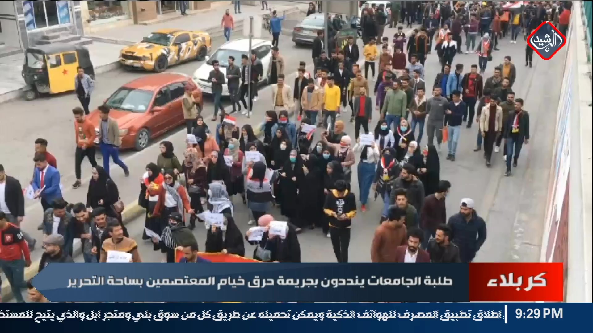 طلبة الجامعات في كربلاء ينددون بجريمة حرق خيام المعتصمين بساحة التحرير